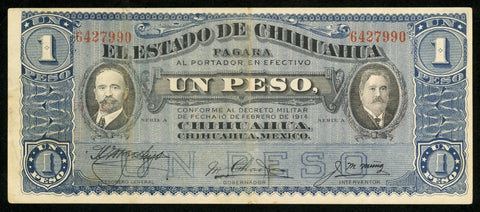 Description: A nice very fine Banknote from the State of Chihuahua in Mexico. The note was issued by "The State of Chihuahua" or "El Estado De Chihuahua." This is the 10 February 1914 decree series A, One Peso. The banknote depicts the portraits of Francisco Madero (President of the United Mexican States) and Abraham Gonzales (Governor of the State of Chihuahua) in black and white over a blue colored background with black writing on the front. It displays the denomination at the four corners and has three signatures. The back is blue in color with the image of the capitol building in its center within a frame and surrounded by two winged allegorical animals. The back also has the denomination displayed in all four corners. The back does have a red scalloped treasury seal for the state of Chihuahua left of center, the date 5-20-15 stamped in red at top center (making it Pick S530e), and the letters KIL-H in red right of center. This particular note has the serial number 6427990 on the front twice Date: May 20, 1915.