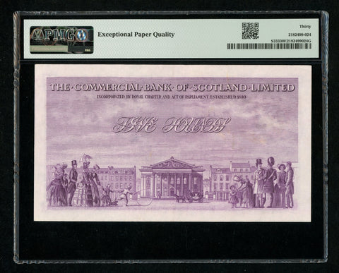 Description: A beautiful very fine banknote issued by The Commercial Bank of Scotland Ltd. This is the 5 pounds sterling note dated 2nd January 1953. The banknote is violet in color on both sides with a yellow tint in portions of the front. It depicts the image of Lord Cockburn in the center on the front flanked by allegorical women representing Agriculture and Navigation with the head of a woman in the bottom left corner. The front also has one signature, the date, a serial number, and the denomination. The back shows the bank headquarter building in Edinburgh with people in Victoria attire promenading in front. The note has a watermark in the top left corner, which depicts the head of a woman. The note has no security thread. This particular note has serial number023146 and it is series 16W. The note is graded by PMG as 30 Very fine EPQ (Except6ional Paper Quality) and comes in a plastic holder so labeled. Please carefully review the scans presented as they are part and parcel of our description.