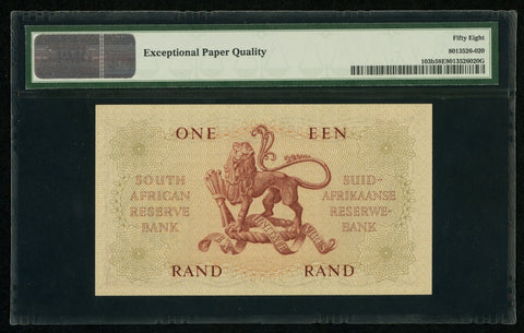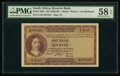 Description: A beautiful Choice About Uncirculated Banknote with Exceptional Paper Quality from South Africa. This is the South African Reserve Bank no date one rand known to have been introduced in 1962 and circulated up to 1965. The banknote is rust brown over multicolored underprint in the front. It displays the portrait of Jan Van Riebeeck in an round frame to the left of the front. The front also depicts the denomination written in English and Afrikaans as well as in numerals. The back is also brown and displays the lion and banner from the coat of arms in the center. The note is written in English on top of Afrikaans on the front and is also in both languages on the back. It is signed by Rissik making it P103b. The front has one signature and the serial number as well as the denomination. This particular note has the serial number A over 124 947227, which is displayed twice on the front in black. The back only displays the name of the bank and the denomination. The note has a watermark displaying the portrait of Jan Van Riebeeck and has no security thread. It is graded Choice About Uncirculated 58 EPQ by PMG and comes in a plastic holder soo labeled. Please carefully review the scan provided as it is part and parcel of our description.
