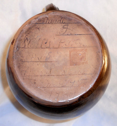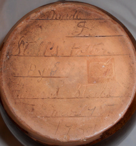 Marks: Hand written on the bottom "Made In Stahl's Pottery By Thomas Stahl Mar 9th 1939" in 7 lines, all in hand written in cursive calligraphy.