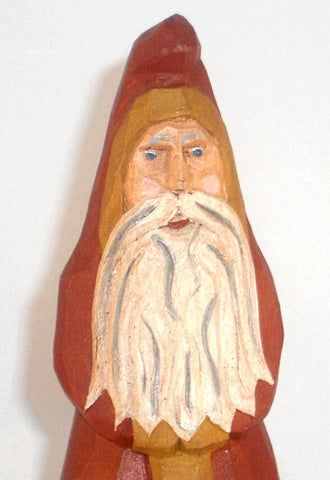 Description: A hand carved wood and polychrome painted American Folk Art figure. The carving shows Santa Clause or Father Christmas standing with his hands within his coat's sleeves. The figure which was carved and painted by Jonathan Bastian shows Santa wearing a red coat with a hood and yellow fringe. Santa is also wearing brown boots. He has a white long beard with dark gray highlights. A great looking nice size carving that is very well done. Santa has carved and painted eyes. Santa's face is painted in flesh tone with gray eye brows and red lips. The piece is signed and dated by the artist on the side of the base. The carving shows quite a bit of details. The entire piece appears to be carved from a single piece of wood. Just a wonderful and nicely done piece of American Folk Art to add to your Americana Collection or your Christmas related collection. Please carefully review the photos presented as they are part and parcel of our description.