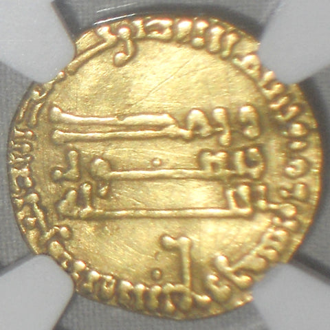 Description: An NGC slabbed gold dinar from Al-Mansur times (the coin does not mention the name of the ruler but it is inferred from the date of minting), who ruled the Muslim empire in the period 136-158 AH (754-775 AD). Al-Mansur is the second caliph of the Abbasid dynasty. His full name being Abu Jafar Abdul Allah al-Mansur. This is a dinar weighs 3.95 grams (indicated on the slab) and is 19 mm in diameter. The coin shows the date of minting as 157 AH and does not indicate where it was minted (most likely at Madinat al-Salam or Baghdad the capital of current day Iraq). The obverse of the coin has the words "La Illaha ell Allah, Wahduh la Sharik Lah" in the center and the words "Muhammad Rasul Allah, arsaluh bil huda wa din al haq liazharuh 'al al-din kulh walaw karah al mushrikon" along the edge. The reverse shows the date in a circle along the edge. It also has the words "Muhammad Rasul Allah" in the center. The coin is graded by as Extremely Fine with by NGC. The being scratches and cleaning. It comes in a plastic slab so labeled. Please note the coin is much better than the photos suggest with very well defined and legible calligraphy and a well centered strike. A definite quality coin. Please carefully review the images presented as they part and parcel of our description.