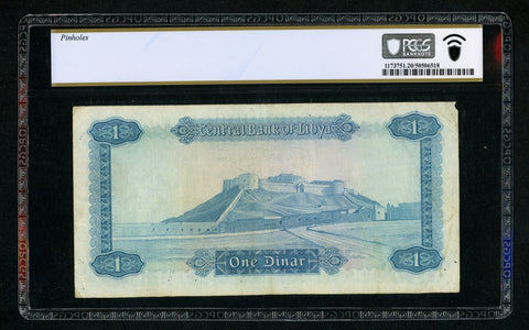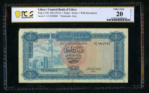 Description: A nice very fine banknote from Libya. This is the Central Bank of Libya issued 1971 one dinar banknote. The banknote is blue in color over multicolored underprint. It is written in Arabic on the front. The front depicts the Marcus Aureus arch with a minaret left of center. The front has one signature, the name of the bank, the denomination, and the serial number. The reverse has the same color scheme of the front and is written in English. It depicts the image of a fortress on top of a hill in the center. The note has a watermark depicting the Libyan arms, eagle standing with a shield on its chest. It also has a solid security thread left of center. This particular note has the serial number 698669 and is series 1C/8. The banknote is graded Very Fine 20 by PCGS Banknote, with the detail being many pinholes. Please carefully review scan as it is part and parcel of our description.