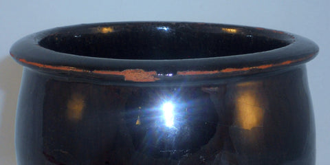 Description: Antique small redware crock, Apple Butter or Preserve Jar with a lead and manganese dark brown glazed exterior and interior. The bottom of the crock is unglazed. The glaze inside and out is the typical dark brown colored glaze used by Christian Link. The glaze is very dark and shiny and is rather difficult to picture. Looking closely at the dark surface one can see the dark brown or black colored mottling within the glaze indicating manganese glaze was used. This wide mouth crock has a round flat base with flared rounded sides which end in a flat outwards projecting and slightly slanted downwards rim. The rim is also glazed with the same dark brown colored glaze used throughout. The interior of the crock is glazed and has some soiling, which we did not attempt to clean. The piece is marked by the maker on the bottom. It is of nice size and would display very well in your collection of antique Pennsylvania redware pottery. Please carefully review the photos as they are part and parcel of our description.