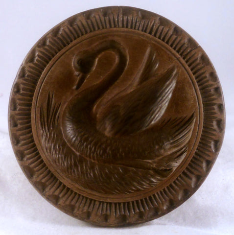 Description: A beautiful vintage turned and carved single piece walnut wood wooden butter print. The butter print, which is made of a single piece of wood, has the very desirable and exceedingly well done design of a swimming swan having raised ruffled wings. The print has an arched back and a round knob handle. The print has a complex carved band along the edge with rays and notches design. The swan is deeply carved and shows of feathers as well as water below it. The print has a round flat surface with a deep carved design of the swan. The swan show lots of intricate details. Again, the entire piece is made of a single piece of wood and has been lightly varnish coated. Please carefully review the photos presented as they are part and parcel of our description.