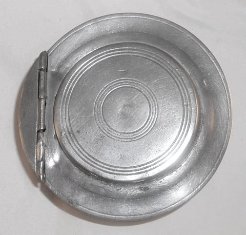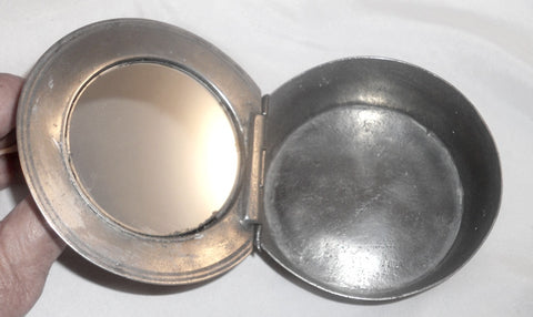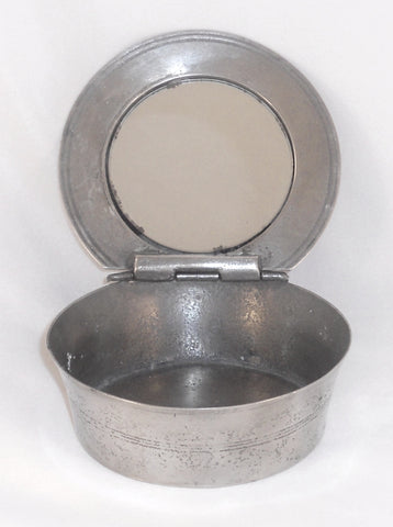 Early 1800s Antique Ashbil Griswold Round Pewter Soap Box Mirror in Hinged Lid