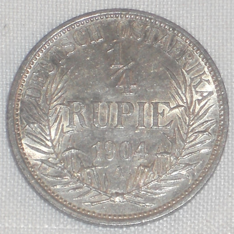 Description: Beautiful toned about uncirculated or much better silver coin dated 1904 from German East Africa. This is a Quarter Rupie or Rupee silver coin. This coin depicts the bust of Kaiser Wilhelm II in an armor, with a crowned eagle on top of his helmet, facing left with the words "GUILELMUS II IMPERATOR" surrounding it, on the obverse. The reverse depicts the words "DUTSCH OSTAFRIKA" above the denomination "1/4 RUPIE 1904 A" in four lines below it within a wreath. The letter "A" stands for the mint in Berlin below. The coin is ~2.9 grams of 0.917silver and measures about 19 millimeters in diameter. It is KM-8. Please carefully review the photos provided as they are part and parcel of our description.