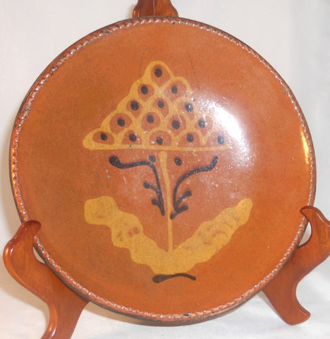 2004 Redware Reproduction Slip Decorated 8 1/2" Deep Plate Cock's Comb Flower by Greg Shooner