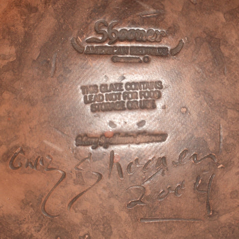 Maker: Greg Shooner Marks: "Shooner American Redware; Oregonia, O; This Glaze Contains Lead; Not for Food Storage or Use; Mary Spellmire Shooner" and signed Greg Shooner 2004 in cursive calligraphy on bottom.