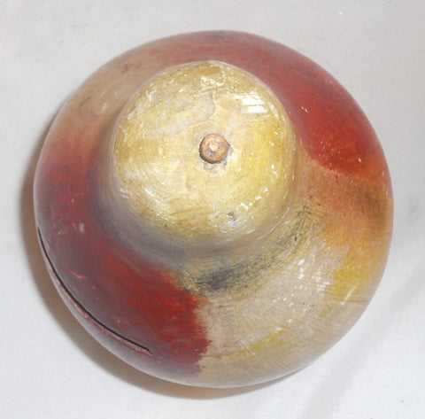 Condition: Bank is in relatively good condition. It has general soiling and displays a few spots where the color is scratched off or has chipped off, but these are small and minimum in number. The bank also has some scratches to the surface, loss of color, and general soiling. The wooden stem on top of the pear is broken off and only a short stub is evident. The bank has no breaks, hairlines, or repairs that we could find. However, the piece has some of the usual issues associated with old piece of primitive pottery such as pops, slubs, uneven surfaces, areas where the coloring did not fully flow, and areas of general roughness. Be that as it may, this is a nice piece in relatively good condition despite being an old toy. Because of the broken stem, we are selling the piece "AS IS" at a fraction of its true value. Please see photos for additional condition information.